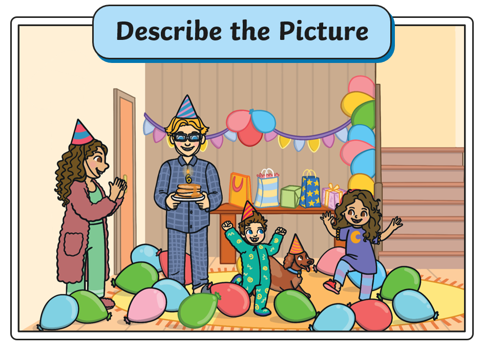 I can see the family. I can see the birthday. I can see the boy and the girl. I can see the mother and the father. I can see the balloons because it is a birthday 🎂.