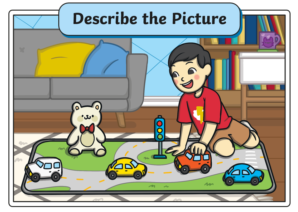 I like the teddy bear because it is cute. I like the cars because they are fun. I like the room because it has many colors. I can see many things, and they are easy to name.