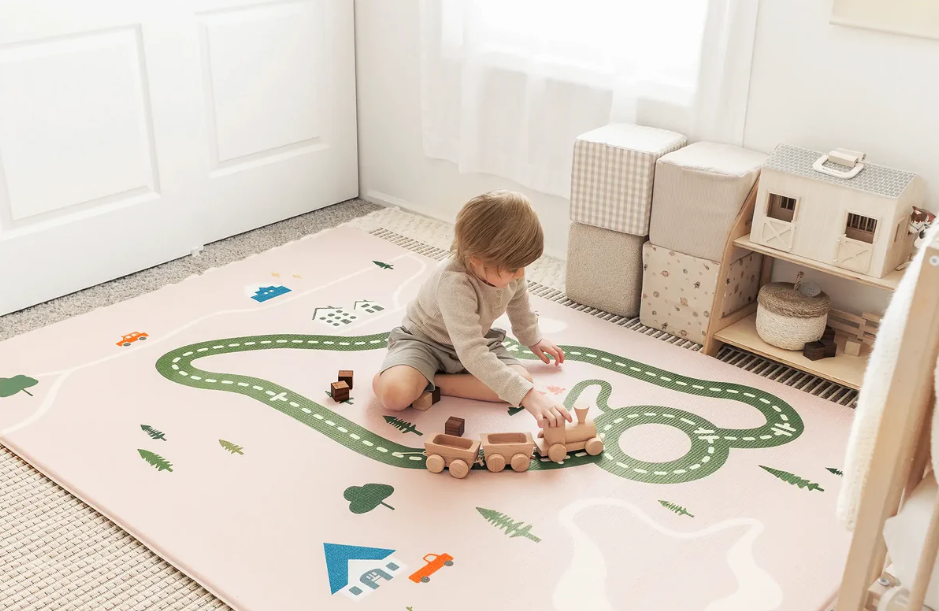 The room has many colors. I see a yellow pillow and a blue pillow. I see books on the shelf. I see a green traffic light on the play mat. The cars look fun and bright. The room looks happy.